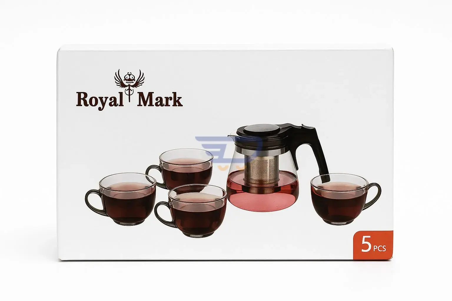 Enjoy your tea moments with style using the Royal Mark Tea Set. This set includes a durable glass teapot with a built-in stainless steel infuser and four elegant glass tea cups, making it ideal for family gatherings or serving guests.